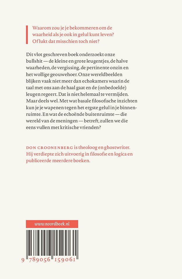 Dit vlot geschreven boek onderzoekt onze bullshit — de kleine en grote leugentjes, de halve waarheden, de vergissing, de pertinente onzin en het wollige geouwehoer. Onze wereldbeelden blijken vaak niet meer dan echokamers waarin de taal met ons aan de haal gaat en de (onbedoelde) leugen regeert. Dat is niet helemaal te vermijden. Maar deels wel. Met wat basale filosofische inzichten kun je je wapenen tegen het ergste gelul in je binnenruimte. En wat de echoënde buitenruimte — die wereld van de meningen — betreft, zullen we die eens vullen met kritische vrienden?