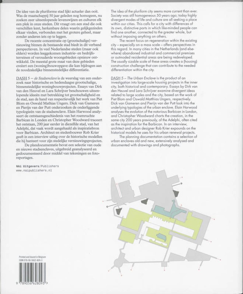 De idee van de pluriforme stad lijkt actueler dan ooit. Was de maatschappij 50 jaar geleden nog homogeen, nu zoeken zeer uiteenlopende levenswijzen en culturen elk een plek in onze steden. DASH 5 De stadsenclave is de weerslag van een onderzoek naar historische en hedendaagse grootschalige, binnenstedelijke woningbouwprojecten. Dit vraagt om een stad die ook verschillen kent, herkenbare delen waarin gelijkgezinden elkaar vinden, verbonden met het grotere geheel, maar zonder anderen iets op te leggen. De recente concentratie op (grootschalige) vernieuwing binnen de bestaande stad biedt in dit verband perspectieven. In veel Nederlandse steden (maar ook elders) worden leeggekomen industrie- en bedrijfsterreinen of verouderde woongebieden opnieuw ontwikkeld. De meestal grote maat van deze gebieden creëert een (woning)bouwopgave die kan bijdragen aan de noodzakelijke binnenstedelijke differentiatie.