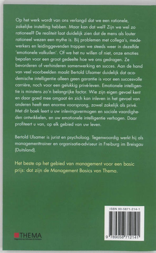 Op het werk wordt van ons verlangd dat we een rationele, zakelijke instelling hebben. Maar kan dat wel? Zijn we wel zo rationeel? De realiteit laat duidelijk zien dat de mens als louter rationeel wezen een mythe is. Bij problemen met collega's, medewerkers en leidinggevenden trappen we steeds weer in dezelfde 'emotionele valkuilen'. Of we dat nu willen of niet, onze emoties bepalen hoe we ons gedragen. Ze bevorderen of verhinderen samenwerking en succes. Aan de hand van vele voorbeelden maakt Bertold Ulsamer duidelijk dat academische intelligentie alleen geen garantie is voor een succesvolle carrière, noch voor een gelukkig privé-leven. Emotionele intelligentie is minstens zo'n belangrijke factor. Wie zijn eigen gevoel kent en daar goed mee omgaat en zich kan inleven in het gevoel van anderen heeft een enorme voorsprong, zowel zakelijk als privé. Met dit boek leert u uw inlevingsvermogen en sociale vaardigheden ontwikkelen en uw emotionele intelligentie verhogen. Daar profiteert u van, op elk gebied van uw leven.