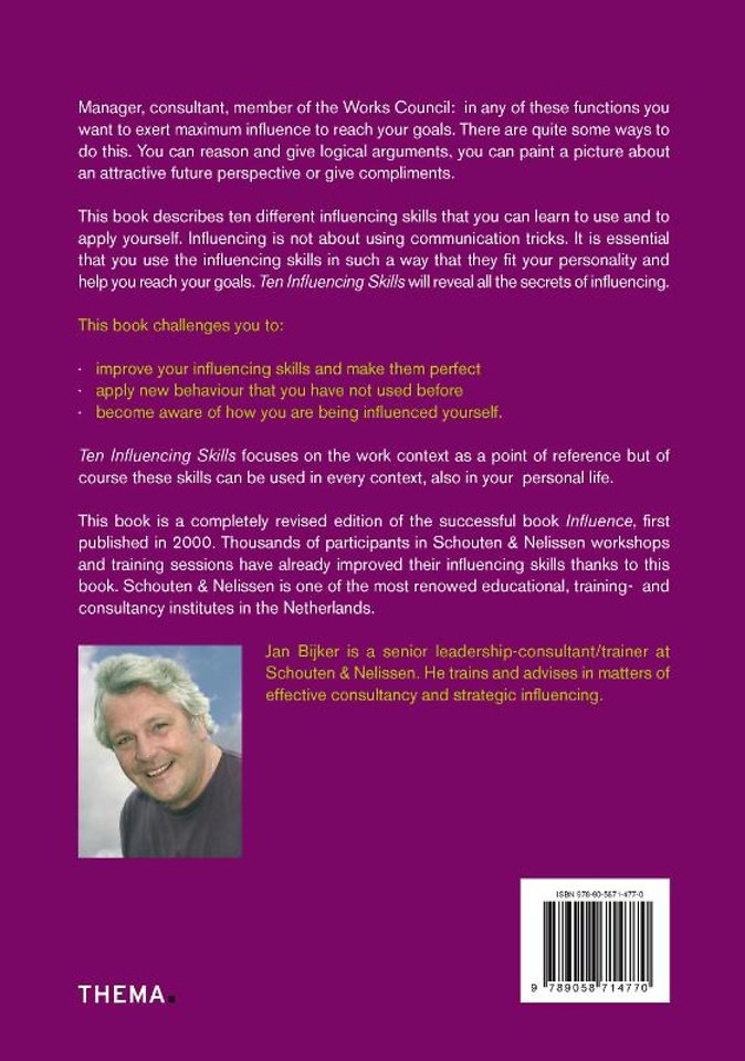 Ten influencing skills is gericht op de werkomgeving als een referentiepunt, maar deze vaardigheden kunnen natuurlijk ook in het dagelijkse leven worden toegepast. Dit boek is een geheel herziene editie van het succesvolle boek Invloed, voor het eerst gepubliceerd in 2000.