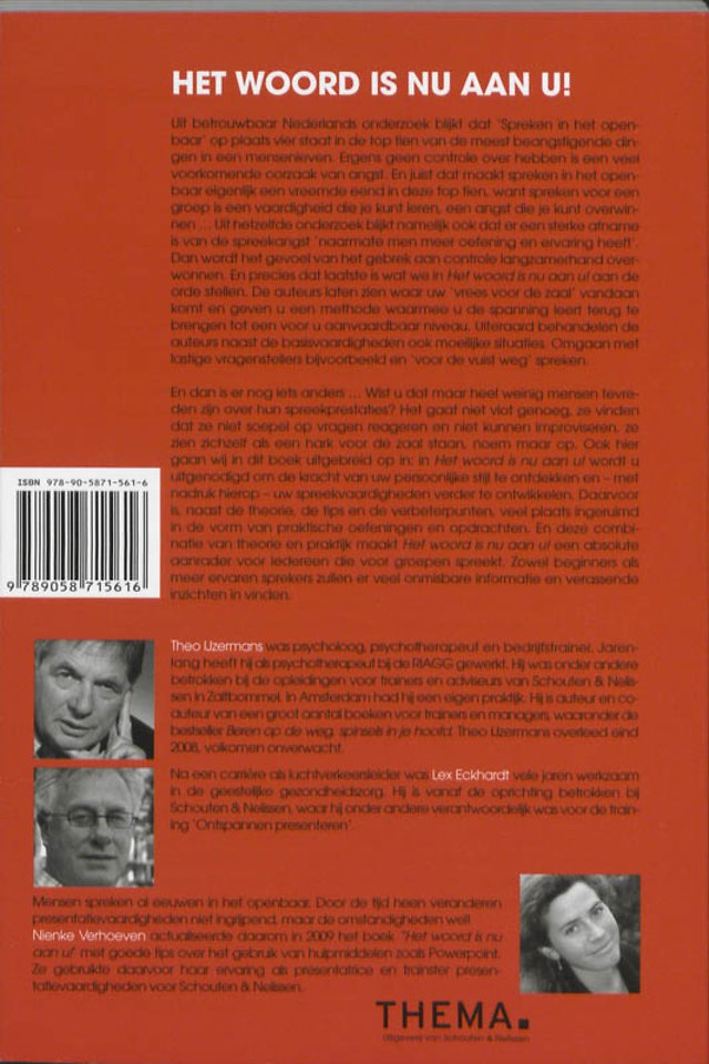 Uit hetzelfde onderzoek blijkt namelijk ook dat er een sterke afname is van de spreekangst naarmate men meer oefening en ervaring heeft. Dan wordt het gevoel van het gebrek aan controle langzamerhand overwonnen. En precies dat laatste is wat 'Het woord is nu aan u!' aan de orde stelt. De auteurs laten zien waar uw vrees voor de zaal vandaan komt en geven u een methode waarmee u de spanning leert terug te brengen tot een voor u aanvaardbaar niveau. Uiteraard behandelen de auteurs naast de basisvaardigheden ook moeilijke situaties. Omgaan met lastige vragenstellers bijvoorbeeld en 'voor de vuist weg' spreken.
