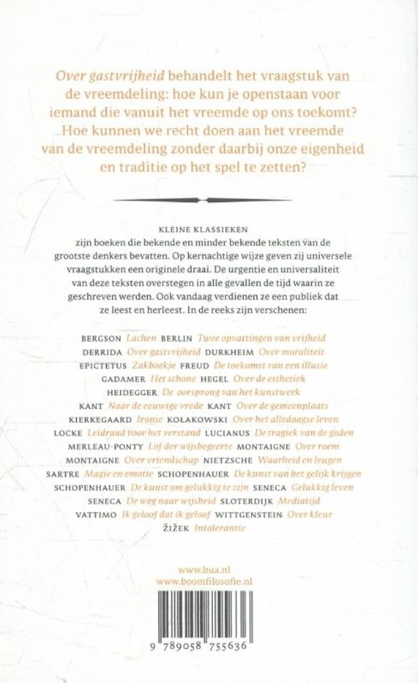 Over gastvrijheid behandelt het vraagstuk van de vreemdeling: hoe kun je openstaan voor iemand die vanuit het vreemde op ons toekomt? Derrida en Dufourmantelle gaan in deze tekst uit van een radicaal concept van gastvrijheid. In de act van echte gastvrijheid staan wij volledig open voor de vreemdeling. Wij schakelen alles wat wij het onze noemen uit om de vreemdeling recht te doen in zijn vreemd-zijn. Deze absolute gastvrijheid is echter onmogelijk, omdat wij geen afstand kunnen doen van wie wij zijn en van de traditie waarin we staan. Toch hebben we dit absolute idee nodig om u¨berhaupt over gastvrijheid te kunnen nadenken. Deze vertaling van Rokus Hofstede verscheen eerder in de reeks Boom Essay (1998) en is door de huidige vluchtelingenstromen weer bijzonder actueel geworden.