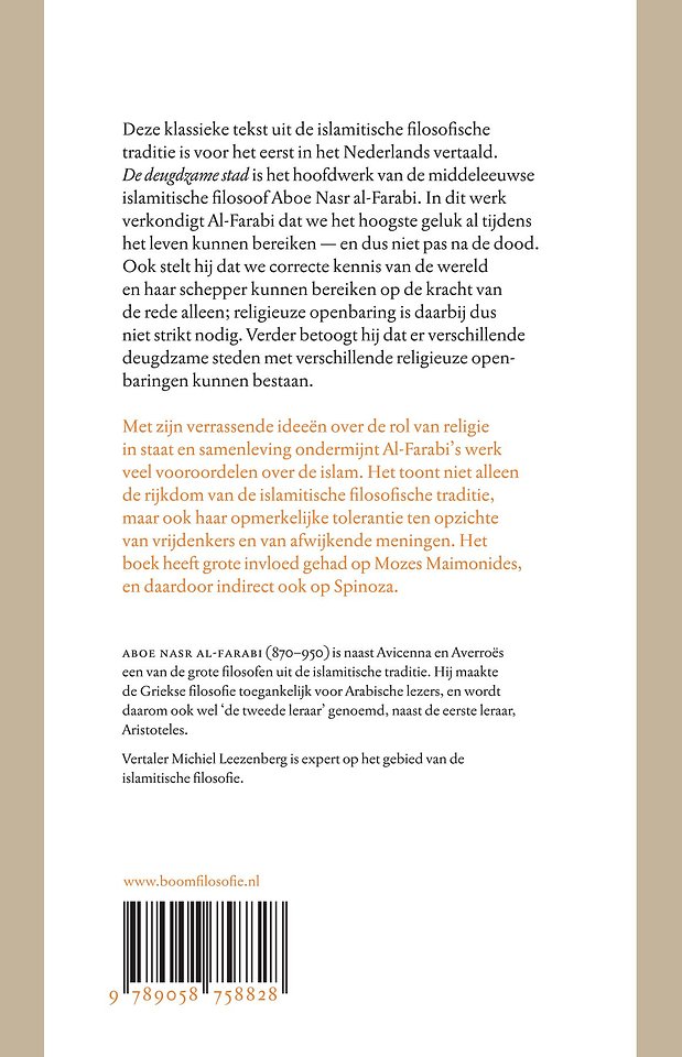Deze klassieke tekst uit de Islamitische filosofische traditie is voor het eerst in het Nederlands vertaald. 'De deugdzame stad' is het hoofdwerk van de middeleeuwse islamitische filosoof Aboe Nasr al-Farabi. In dit werk verkondigt Al-Farabi dat we de hoogste geluk al tijdens het leven kunnen bereiken – en dus niet pas na de dood.