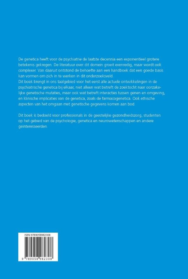 De genetica heeft voor de psychiatrie de laatste decennia een exponentieel grotere betekenis gekregen. De literatuur over dit domein groeit evenredig, maar wordt ook complexer. Van daaruit ontstond de behoefte aan een handboek dat een goede basis kan vormen om zich in te werken in dit onderzoeksveld. Dit boek brengt in ons taalgebied voor het eerst alle actuele ontwikkelingen in de psychiatrische genetica bij elkaar, niet alleen wat betreft de zoektocht naar oorzakelijke genetische mutaties, maar ook wat betreft interacties tussen genen en omgeving, en klinische implicaties van de genetica, zoals de farmacogenetica. Ook ethische aspecten van het omgaan met genetische gegevens komen aan bod.