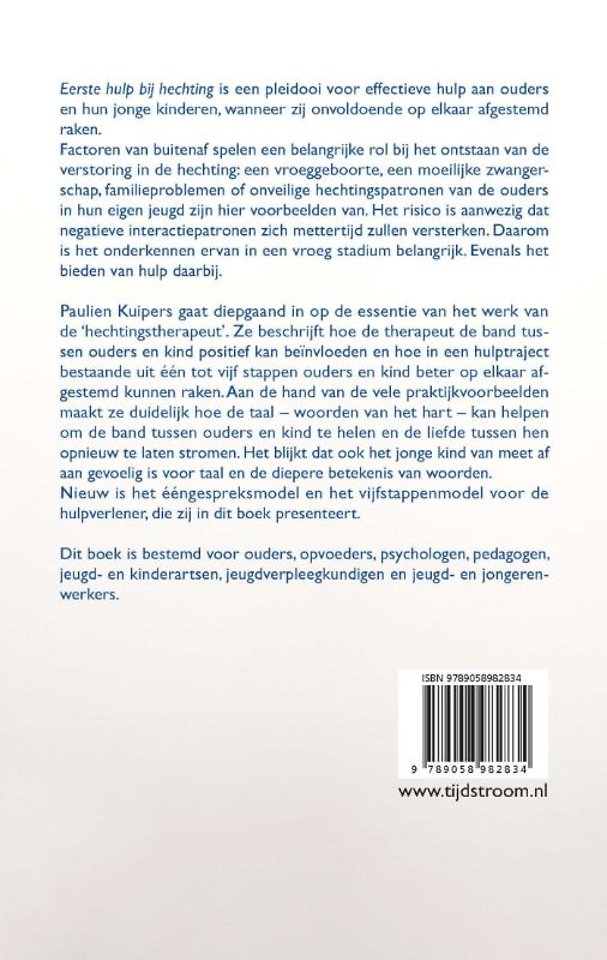Eerste hulp bij hechting is een pleidooi voor effectieve hulp aan ouders en hun jonge kinderen, wanneer zij onvoldoende op elkaar afgestemd raken.Factoren van buitenaf spelen een belangrijke rol bij het ontstaan van de verstoring in de hechting: een vroeggeboorte, een moeilijke zwangerschap, familieproblemen of onveilige hechtingspatronen van de ouders in hun eigen jeugd zijn hier voorbeelden van. Het risico is aanwezig dat negatieve interactiepatronen zich mettertijd zullen versterken. Daarom is het onderkennen ervan in een vroeg stadium belangrijk. Evenals het bieden van hulp daarbij.Paulien Kuipers gaat diepgaand in op de essentie van het werk van de 'hechtingstherapeut'. Ze beschrijft hoe de therapeut de band tussen ouders en kind positief kan beïnvloeden en hoe in een hulptraject bestaande uit één tot vijf stappen ouders en kind beter op elkaar afgestemd kunnen raken. Aan de hand van de vele praktijkvoorbeelden maakt ze duidelijk hoe de taal - woorden van het hart - kan helpen om de band tussen ouders en kind te helen en de liefde tussen hen opnieuw te laten stromen. Het blijkt dat ook het jonge kind van meet af aan gevoelig is voor taal en de diepere betekenis van woorden.Nieuw is het ééngespreksmodel en het vijfstappenmodel voor de hulpverlener, die zij in dit boek presenteert.Dit boek is bestemd voor ouders, opvoeders, psychologen, pedagogen, jeugd- en kinderartsen, jeugdverpleegkundigen en jeugd- en jongerenwerkers.Professionals kunnen een essentiële bijdrage leveren aan het herstellen of versterken van de verbinding tussen ouders en kinderen. In de therapeutische praktijk komen de pijn en de negatieve patronen tussen generaties aan het licht. Dit boek laat zien hoe de therapeut vorm kan geven aan het echt helpen 'zien' van kind en ouder en raakt daarmee een diepere laag van het professioneel pedagogisch werken, die onze aandacht behoeft.Dr. Christa Nieuwboer, lector Fontys Hogeschool PedagogiekAls wetenschappelijk onderzoeker op het gebied van ouder-kindrelaties ben ik verheugd dat er professionals zijn die de theorie van de Britse psychiater John Bowlby kunnen omzetten in handreikingen voor de praktijk en hierdoor wetenschappelijke kennis eenvoudig toegankelijk maken voor hulpverleners en gezinnen. Het zijn uiteindelijk de ouders en kinderen die baat hebben bij dit uiterst inspirerende boek. Zij kunnen de toekomst weer hoopvol, met energie en met plezier in elkaar tegemoet zien.Prof.dr. Hedwig van Bakel, hoogleraar Infant Mental Health, Tranzo - Tilburg University