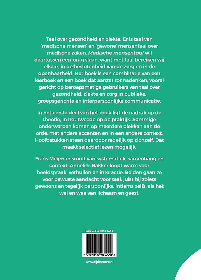 Taal over gezondheid en ziekte. Er is taal van ‘medische mensen’ en ‘gewone’ mensentaal over medische zaken. Medische mensentaal wil daartussen een brug slaan, want met taal bereiken wij elkaar, in de beslotenheid van de zorg en in de openbaarheid. Het boek is een combinatie van een leerboek en een boek dat aanzet tot nadenken, vooral gericht op beroepsmatige gebruikers van taal over gezondheid, ziekte en zorg in publieke, groepsgerichte en interpersoonlijke communicatie.