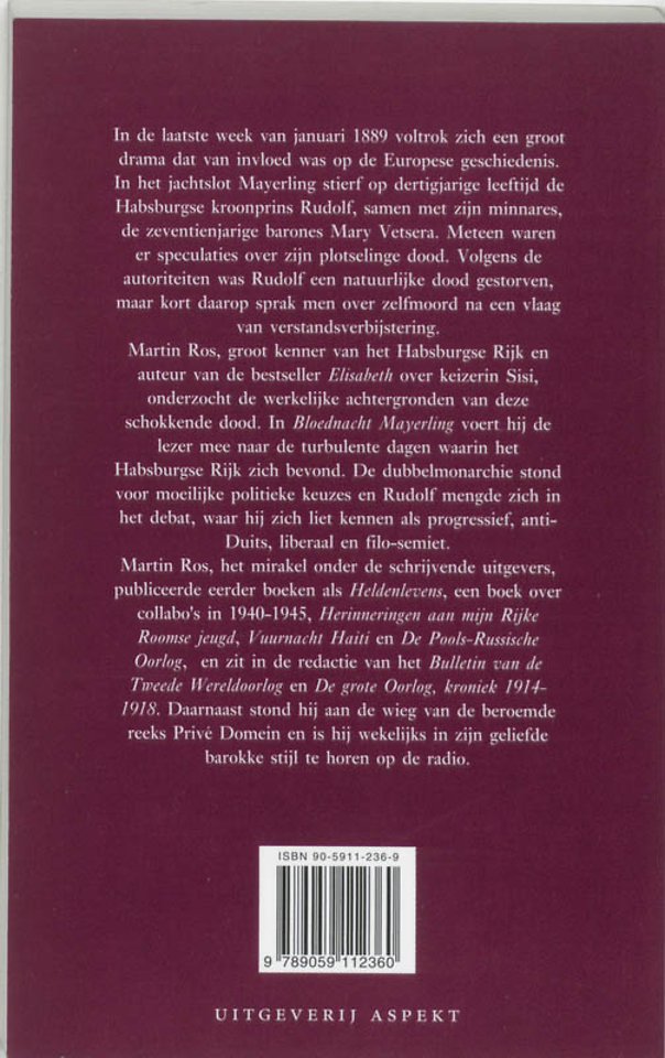 Martin Ros, groot kenner van het Habsburgse Rijk en auteur van de bestseller Elisabeth over keizerin Sisi, onderzocht de werkelijke achtergronden van deze schokkende dood. In Bloednacht Mayerling voert hij de lezer mee naar de turbulente dagen waarin het Habsburgse Rijk zich bevond. De dubbelmonarchie stond voor moeilijke politieke keuzes en Rudolf mengde zich in het debat, waar hij zich liet kennen als progressief, anti-Duits, liberaal en filo-semiet.
