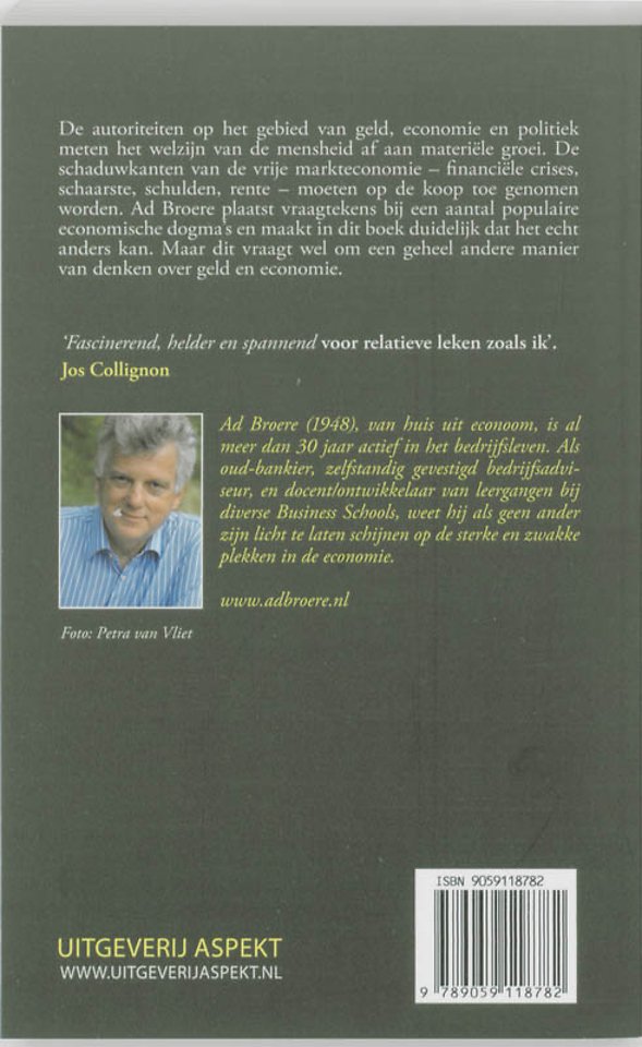 Meer over Ad BroereDe autoriteiten op het gebied van geld, economie en politiek meten het welzijn van de mensheid af aan materiele groei. De schaduwkanten van de vrije markteconomie - financiële crises, schaarste, schulden, rente - moeten op de koop toe genomen worden. Ad Broere plaatst vraagtekens bij een aantal populaire economische dogma's en maakt in dit boek duidelijk dat het echt anders kan. Maar dit vraagt wel om een geheel andere manier van denken over geld en economie.
