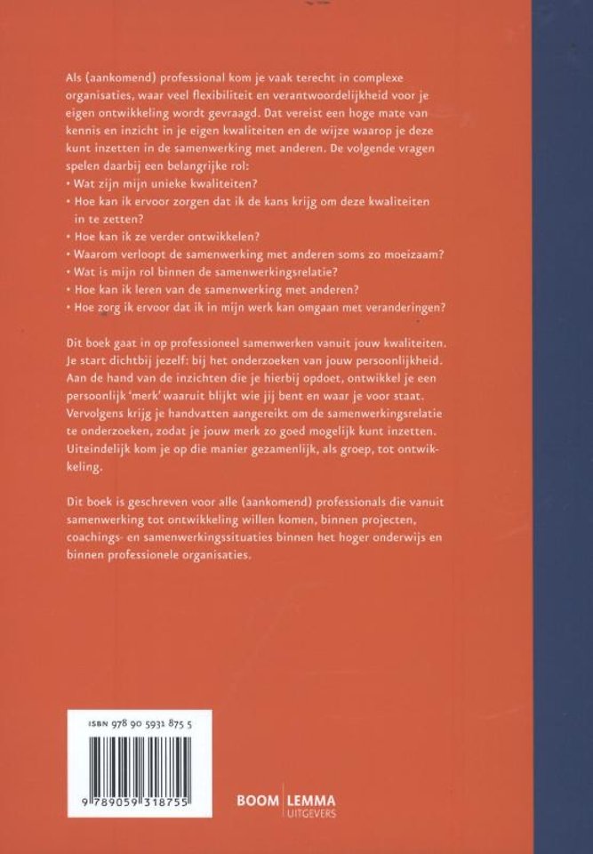 Dit boek gaat in op professioneel samenwerken vanuit uw kwaliteiten. U start dichtbij uzelf: bij het onderzoeken van uw persoonlijkheid. Aan de hand van de inzichten die u hierbij opdoet, ontwikkelt u een persoonlijk 'merk' waaruit blijkt wie u bent en waar u voor staat. Vervolgens krijgt u handvatten aangereikt om de samenwerkingsrelatie te onderzoeken, zodat u uw merk zo goed mogelijk kunt inzetten. Uiteindelijk komt u op die manier gezamenlijk, als groep, tot ontwikkeling.