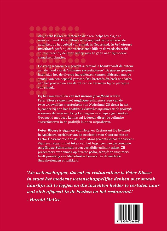 Ook is er aandacht voor proeven en de rol van de hersenen bij de perceptie van smaak. Voor dit boek werkte hij samen met Angélique Schmeinck, een van de twee vrouwelijke meesterkoks van Nederland - een bijzondere combinatie van kennis en creativiteit.