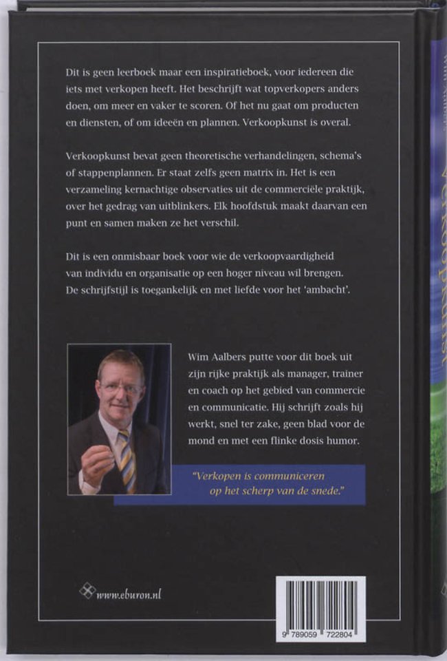 Meer over Wim AalbersDit is geen leerboek maar een inspiratieboek, voor iedereen die iets met verkopen heeft. Het beschrijft wat topverkopers anders doen, om meer en vaker te scoren. Of het nu gaat om producten en diensten, of om ideeën en plannen. Verkoopkunst is overal. 'Verkoopkunst' bevat geen theoretische verhandelingen, schema's of stappenplannen. Er staat zelfs geen matrix in. Het is een verzameling kernachtige observaties uit de commerciële praktijk, over het gedrag van uitblinkers. Elk hoofdstuk maakt daarvan een punt en samen maken ze het verschil.