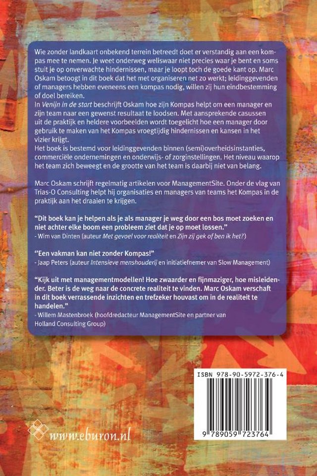 In 'Venijn in de start' beschrijft Oskam hoe zijn Kompas helpt om een manager en zijn team naar een gewenst resultaat te loodsen. Met aansprekende casussen uit de praktijk en heldere voorbeelden wordt toegelicht hoe een manager door gebruik te maken van het Kompas vroegtijdig hindernissen en kansen in het vizier krijgt.