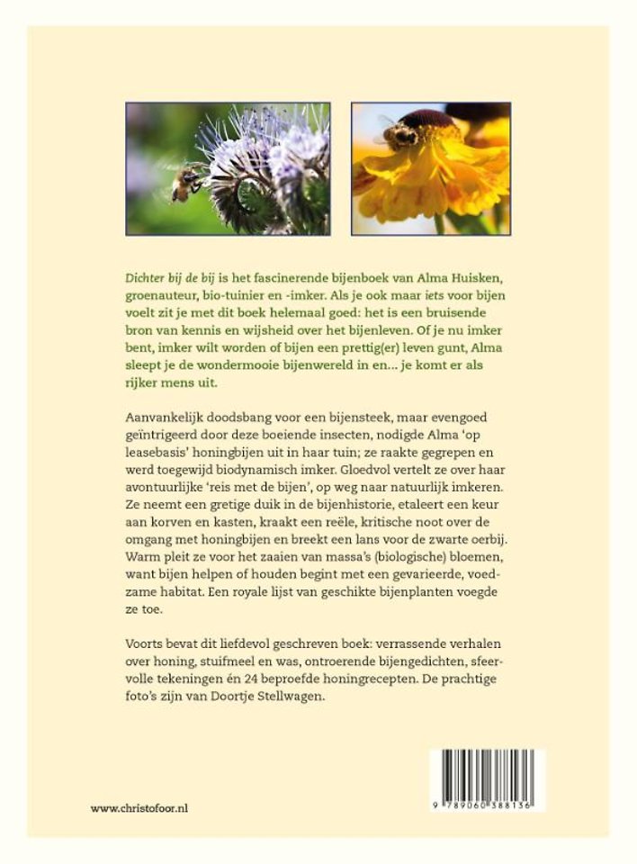 Dichter bij de bij is het fascinerende bijenboek van Alma Huisken, groenauteur, bio-tuinier en -imker. Als je ook maar iets voor bijen voelt zit je met dit boek helemaal goed: het is een bruisende bron van kennis en wijsheid over het bijenleven. Of je nu imker bent, imker wilt worden of bijen een prettig(er) leven gunt, Alma sleept je de wondermooie bijenwereld in en... je komt er als rijker mens uit.