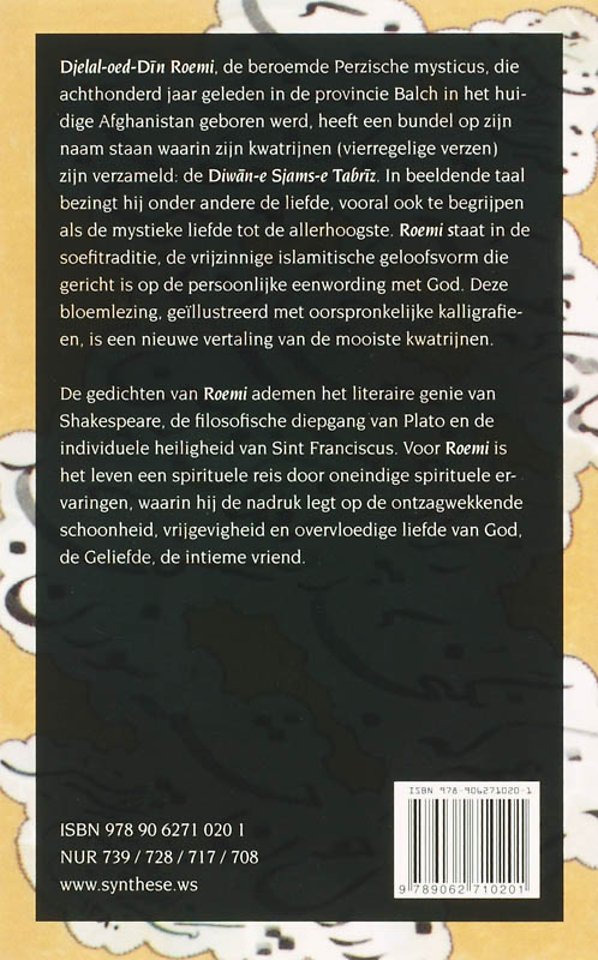 Djelal-oed-Din Roemi, de beroemde Perzische mysticus, die achthonderd jaar geleden in de provincie Balch in het huidige Afghanistan geboren werd, heeft een bundel op zijn naam staan waarin zijn kwatrijnen (vierregelige verzen) zijn verzameld: de Diwan-e Sjams-e Tabriz. In beeldende taal bezingt hij onder andere de liefde, vooral ook te begrijpen als de mystieke liefde tot de allerhoogste. Roemi staat in de soefitraditie, de vrijzinnige islamitische geloofsvorm die gericht is op de persoonlijke eenwording met God. Deze bloemlezing, ge ustreerd met oorspronkelijke kalligrafieen, is een nieuwe vertaling van de mooiste kwatrijnen.