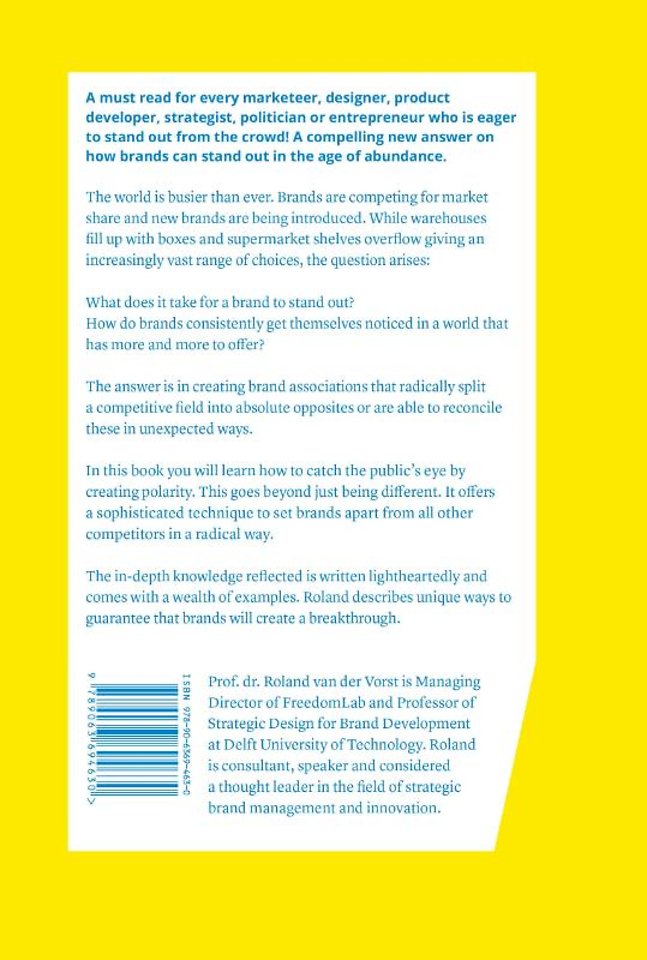 The answer is certainly not to create more and more messages. Instead, brand managers should be able to craft 'polar' brand associations. In this book, professor, top strategist and entrepreneur Roland van der Vorst shows how brands catch the eye by creating polarity. This goes further than just being different. It's a sophisticated technique to set brands apart from all other competitors in a radical way. This can be done by creating brand associations that radically split a competitive field into absolute opposites or are able to reconcile these in unexpected ways. Lightheartedly and with a wealth of examples, he describes unique ways of guaranteeing brands to create a break through. Contrarian Branding is a must for brands eager to stand out from the crowd.