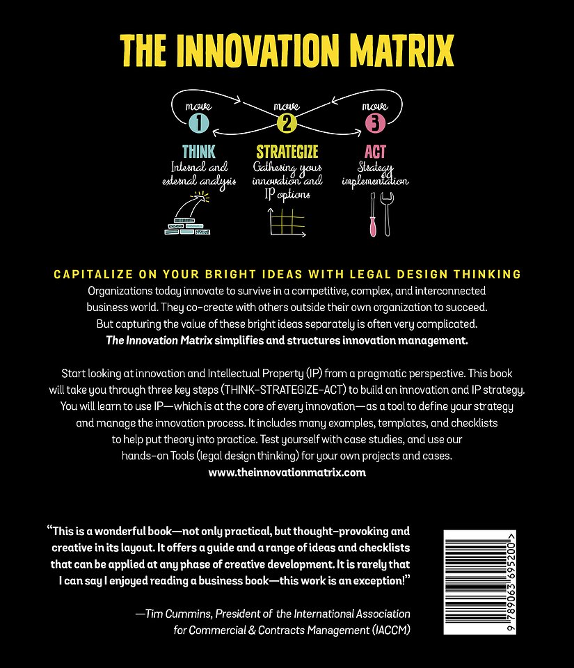'The Innovation Matrix' simplifies and structures innovation management. Start looking at innovation and Intellectual Property (IP) from a pragmatic perspective. This book will take you through three key steps (THINK-STRATEGIZE-ACT) to build an innovation and IP strategy. You will learn to use IP—which is at the core of every innovation—as a tool to define your strategy and manage the innovation process. It includes many examples, templates, and checklists to help put theory into practice. Test yourself with case studies, and use our hands-on Tools (legal design thinking) for your own projects and cases.