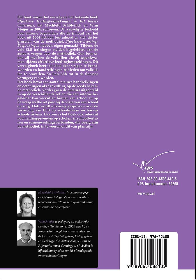 Dit boek vormt het vervolg op het bekende boek Effectieve leerlingbesprekingen in het basisonderwijs, dat Machteld Schölvinck en Wim Meijer in 2004 schreven. Dit vervolgboek is bedoeld voor interne begeleiders en heeft als doel vragen te beantwoorden en handreikingen te bieden om valkuilen te omzeilen. Zo kan ELB tot in de finesses vormgegeven worden. Het boek bevat een aantal handreikingen en oefeningen als aanvulling op de reeds bekende methodiek. Verder gaan de auteurs uitgebreid in op de verschillende rollen die een interne begeleider kan vervullen binnen een school en op de vraag welke rol past bij de visie van een school op zorg. Ook wordt uitvoerig gesproken over de invoering van ELB op schoolniveau en bovenschools niveau. Daarom is het boek ook relevant voor leidinggevenden op scholen, in schoolbesturen en samenwerkingsverbanden, die bezig zijn de methodiek in te voeren of dit van plan zijn.