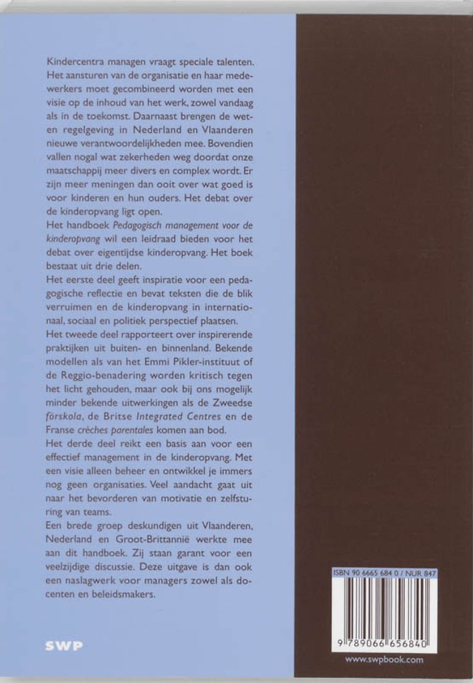 Het handboek 'Pedagogisch management in de kinderopvang' wil een leidraad bieden voor het debat over eigentijdse kinderopvang. Het boek bestaat uit drie delen. Het eerste deel geeft inspiratie voor een pedagogische reflectie en bevat teksten die de blik verruimen en de kinderopvang in internationaal, sociaal en politiek perspectief plaatsen.