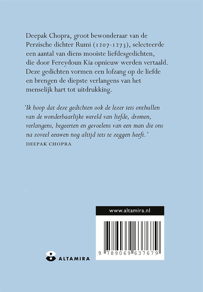 Achthonderd jaar geleden werd de grote Perzische soefidichter en mysticus Rumi geboren. In Turkije wordt deze 'meester-alchemist van de liefde' vereerd als een nationale held en in de Verenigde Staten geldt hij als de meest gelezen dichter. Deepak Chopra, een groot bewonderaar van Rumi, selecteerde een aantal van diens mooiste liefdesgedichten, die door Fereydoun Kia opnieuw werden vertaald. Zij vormen een lofzang op de liefde en brengen de diepste verlangens van het menselijk hart dat op zoek is naar het goddelijke, tot uitdrukking. Elke poëtische fluistering is een getuigenis van de hartstocht die menselijke relaties doordringt.