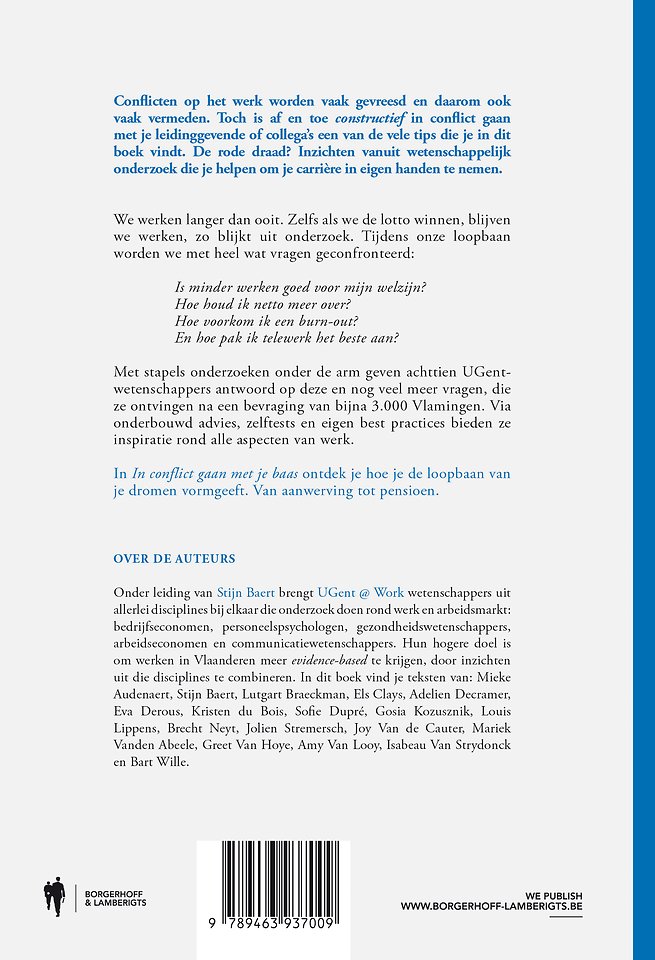Conflicten op het werk worden vaak gevreesd en daarom ook vaak vermeden. Toch is af en toe constructief in conflict gaan met je leidinggevende of collega’s een van de vele tips die je in dit boek vindt. De rode draad? Inzichten vanuit wetenschappelijk onderzoek die je helpen om je carrière in eigen handen te nemen.