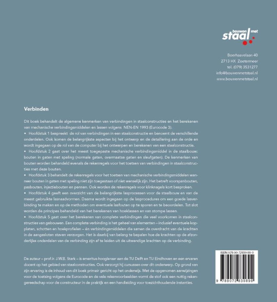 Dit boek behandelt de algemene kenmerken van verbindingen in staalconstructies en het berekenen van mechanische verbindingsmiddelen en lassen volgens NEN-EN 1993 (Eurocode 3).