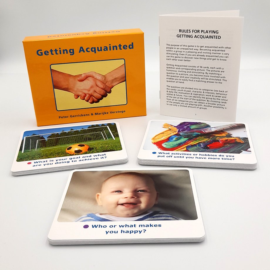 Met behulp van 'Getting Acquainted' leert u anderen op een verrassende manier (nog beter) kennen. Het spel bestaat uit 56 kaarten (10 x 12 cm) met daarop een kleurenfoto en een bijpassende vraag. De foto's zijn uitnodigend, indringend, humoristisch of prikkelend. Het koppelen van een foto aan een vraag verhoogt de betrokkenheid bij de vraag en stimuleert de creativiteit. De vragen zijn verdeeld over zes groepen: