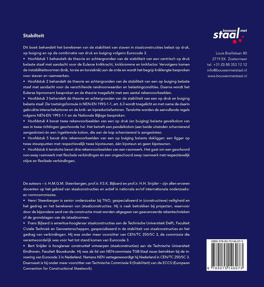 Dit boek behandelt het berekenen van de stabiliteit van staven in staalconstructies belast op druk, op buiging en op de combinatie van druk en buiging volgens Eurocode 3.
