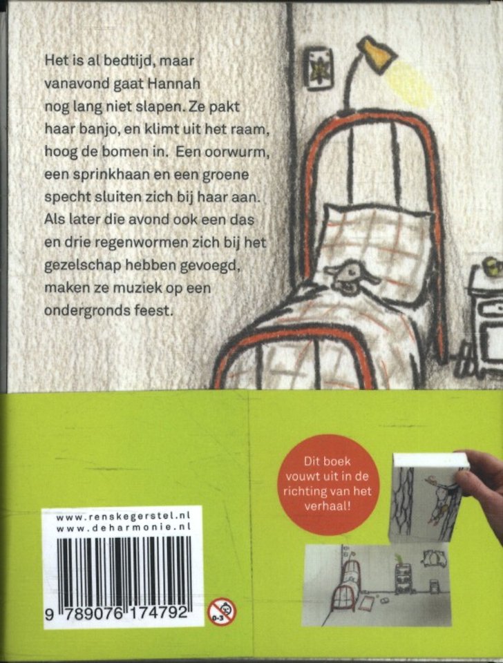 Het is al bedtijd, maar vanavond gaat Hannah nog lang niet slapen. Ze pakt haar banjo, een zaklamp en een schep en klimt uit het raam, hoog de bomen in. Een oorwurm, een sprinkhaan en een groene specht sluiten zich bij haar aan, verder omhoog. Als later ook een das en drie regenwormen zich bij het gezelschap hebben gevoegd, belanden ze op een ondergronds feest en maken ze samen muziek.