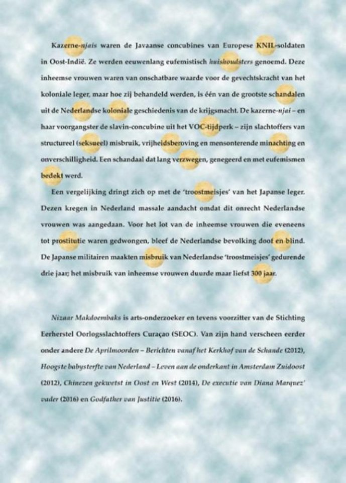 Kazerne-njais waren de Javaanse concubines van Europese KNIL-soldaten in Oost-Indië. Ze werden eeuwenlang eufemistisch huishoudsters genoemd. Deze inheemse vrouwen waren van onschatbare waarde voor de gevechtskracht van het koloniale leger, maar hoe zij behandeld werden, is één van de grootste schandalen uit de Nederlandse koloniale geschiedenis van de krijgsmacht. De kazerne-njai - en haar voorgangster de slavin-concubine uit het VOC-tijdperk - zijn slachtoffers van structureel (seksueel) misbruik, vrijheidsberoving en mensonterende minachting en onverschilligheid. Een schandaal dat lang verzwegen, genegeerd en met eufemismen bedekt werd.
