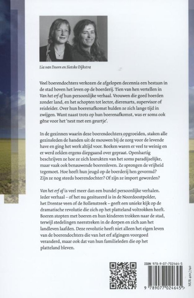 Veel boerendochters verkozen afgelopen decennia een bestaan in de stad boven het leven op de boerderij. Tien van hen vertellen in 'Van het erf af' hun persoonlijke verhaal. Vrouwen die goed boerden zonder land, en het schopten tot lector, dierenarts, supervisor of reisleider. Over hun boerenafkomst hulden ze zich lange tijd in zwijgen. Want naast trots op hun boerenafkomst, was er ook gêne voor het 'nest met een geurtje'.