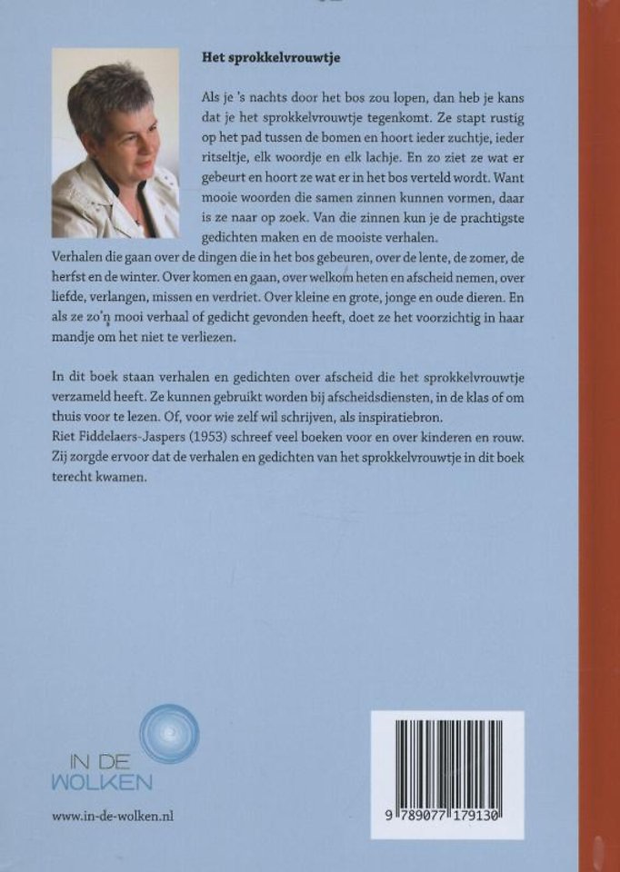 In dit boek staan verhalen en gedichten over afscheid die het sprokkelvrouwtje verzameld heeft. Ze kunnen worden gebruikt bij afscheidsdiensten, in de klas of om thuis voor te lezen. Of, voor wie zelf wil schrijven, als inspiratiebron.