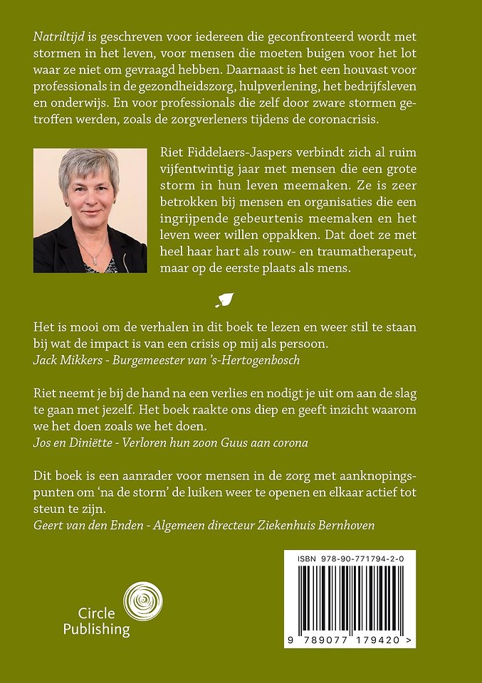 Riet Fiddelaers-Jaspers verbindt zich al ruim vijfentwintig jaar met mensen die een grote storm in hun leven meemaken. Ze is zeer betrokken bij mensen en organisaties die een ingrijpende gebeurtenis meemaken en het leven weer willen oppakken. Dat doet ze met heel haar hart als rouw- hechtings- en traumatherapeut maar op de eerste plaats als mens.