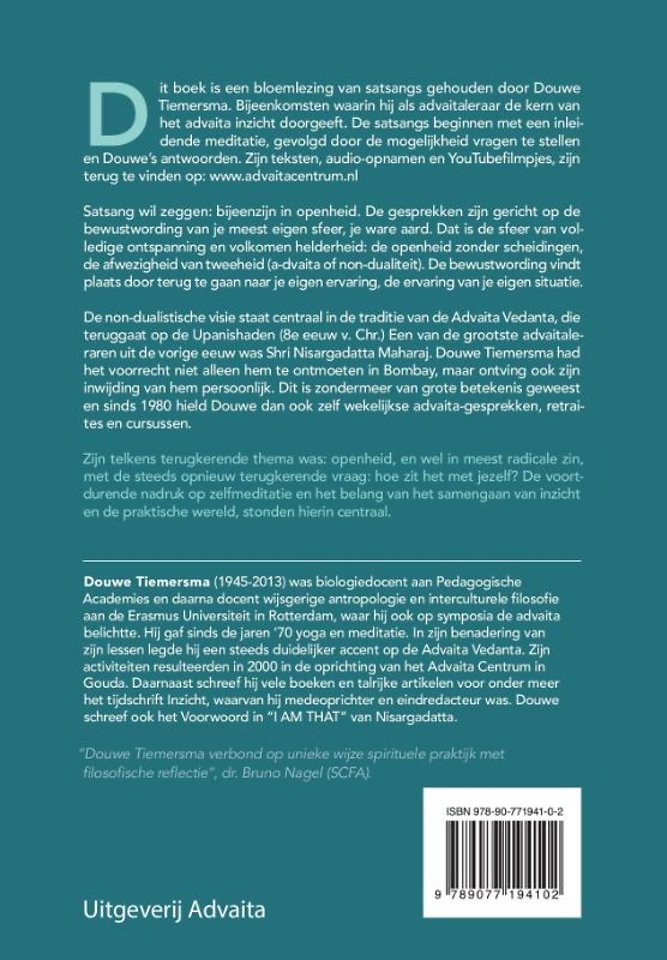 Douwe Tiemersma hield als advaitaleraar wekelijks gesprekken/satsangs sinds 1980, direct na zijn ingrijpende ontmoetingen met Sri Nisargadatta Maharaj in Bombay die hem een inwijding gaf. Nog voor zijn overlijden heeft Douwe een aantal van deze satsangs geselecteerd. In dit laatste boek zijn deze teksten die hij allen zelf heeft geredigeerd gebundeld.