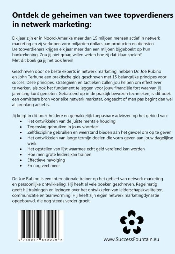 Geschreven door de beste experts in netwerk marketing, hebben Dr. Joe Rubino en John Terhune een praktische gids geschreven met 15 belangrijke principes voor succes. Deze principes, strategieën en tactieken zullen jou helpen om effectiever te werken als ook het fundament te leggen voor jouw financiële fort waarvan jij jarenlang kunt genieten. Gebaseerd op in de praktijk bewezen technieken, is dit boek een onmisbare bron voor elke netwerk marketer, ongeacht of men pas begint dan wel al jarenlang actief is.