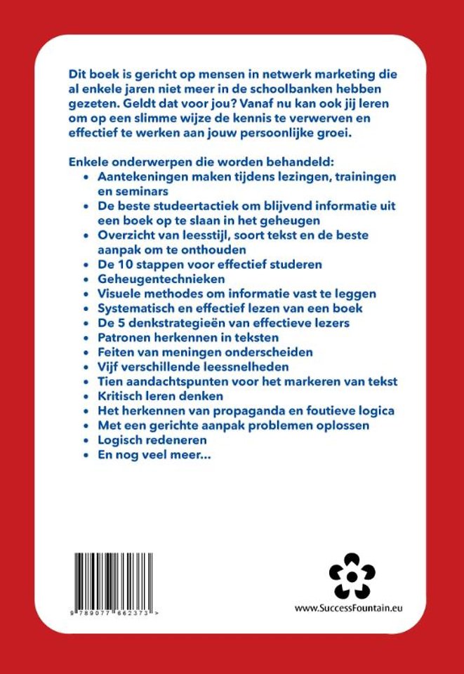 Dit boek is gericht op mensen in netwerk marketing die al enkele jaren niet meer in de schoolbanken hebben gezeten. Geldt dat voor jou? Vanaf nu kan ook jij leren om op een slimme wijze de kennis te verwerven en effectief te werken aan jouw persoonlijke groei.