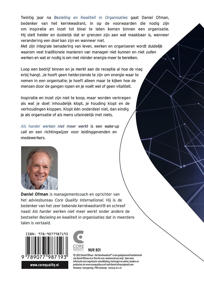 Met zijn integrale benadering van leven, werken en organiseren wordt duidelijk waarom veel traditionele manieren van managen niet kunnen en niet zullen werken en wat er nodig is om met minder energie meer te bereiken.