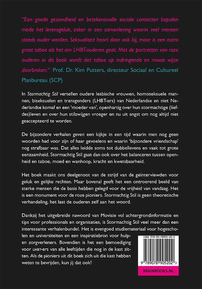 Het boek maakt ons deelgenoot van de strijd van de geïnterviewden voor geluk en gelijke rechten. Maar bovenal geeft het een ontroerend beeld van sterke mensen die de basis hebben gelegd voor de vrijheid van vandaag. Het is een monument voor de roze pioniers. Stormachtig Stil is geen theoretische verhandeling, het laat de ouderen zelf aan het woord.