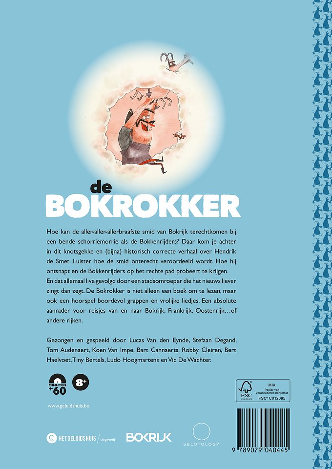 Hoe kan de aller-aller-allerbraafste smid van Bokrijk terechtkomen bij een bende schorriemorrie als de Bokkenrijders? Daar kom je achter in dit knotsgekke en (bijna) historisch correcte verhaal over Hendrik de Smet. Luister hoe de smid onterecht veroordeeld wordt, ontsnapt en de Bokkenrijders op het rechte pad probeert te krijgen. En dat allemaal live gevolgd door een stadsomroeper die het nieuws liever zingt dan zegt. De Bokrokker is niet alleen een boek om te lezen, maar ook een hoorspel boordevol grappen en vrolijke liedjes. Een absolute aanrader voor reisjes van en naar Bokrijk, Frankrijk, Oostenrijk …of andere rijken.