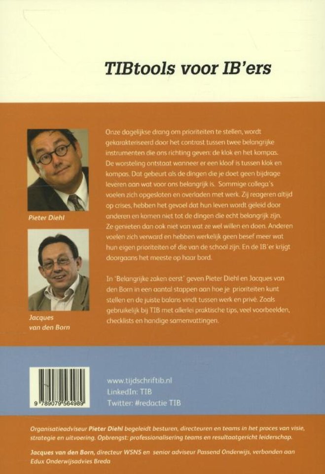 In 'Belangrijke zaken eerst' geven Pieter Diehl en Jacques van den Born in een aantal stappen aan hoe je prioriteiten kunt stellen en de juiste balans vindt tussen werk en privé. Zoals gebruikelijk bij TIB met allerlei praktische tips, veel voorbeelden, checklists en handige samenvattingen.