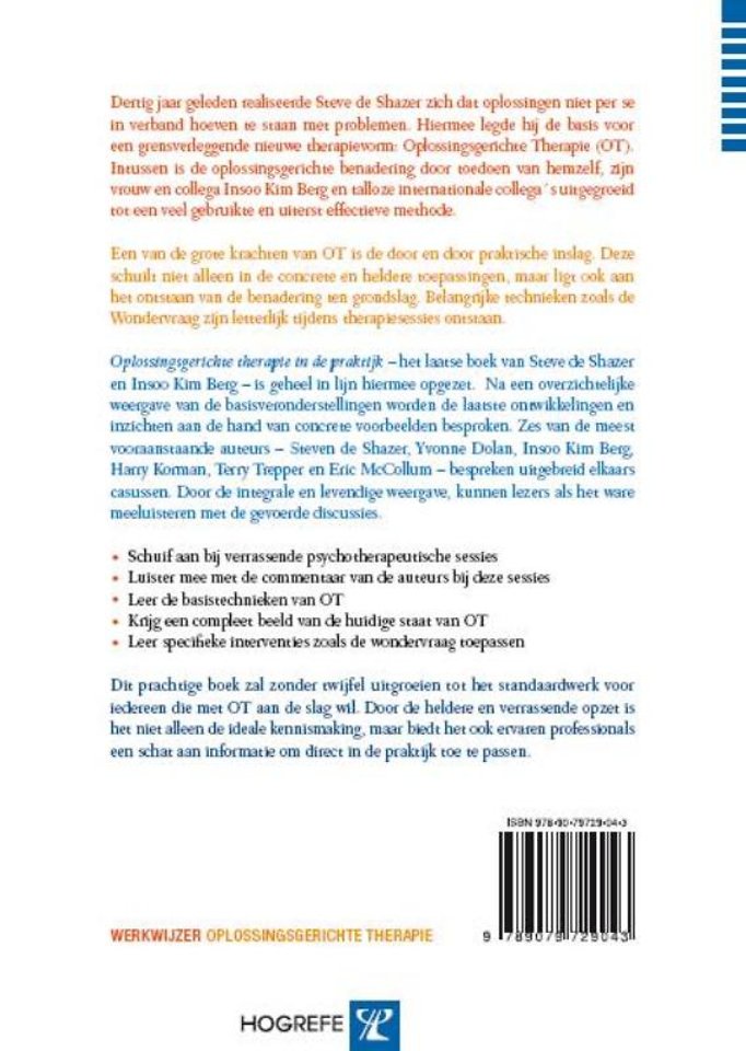 Oplossingsgerichte therapie in de praktijk - het laatste boek van Steve de Shazer en Insoo Kim Berg - is geheel in lijn hiermee opgezet. Na een overzichtelijke weergave van de basisveronderstellingen worden de laatste ontwikkelingen en inzichten aan de hand van concrete voorbeelden besproken. Zes van de meest vooraanstaande auteurs - Steven de Shazer, Yvonne Dolan, Insoo Kim Berg, Harry Korman, Terry Trepper en Eric McCollum - bespreken uitgebreid elkaars casussen. Door de integrale en levendige weergave, kunnen lezers als het ware meeluisteren met de gevoerde discussies.