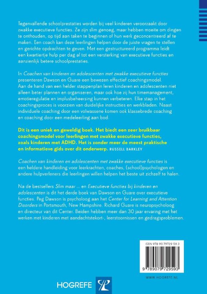 Na de bestsellers 'Slim maar...' en 'Executieve functies bij kinderen en adolescenten' is dit het derde boek van Dawson en Guare over executieve functies. Peg Dawson is psycholoog aan het Center for Learning and Attention Disorders in Portsmouth, New Hampshire. Richard Guare is neuropsycholoog en directeur van dit Center. Beiden hebben meer dan 30 jaar ervaring met het werken met kinderen met aandachtstekort-, leerstoornissen en gedragsproblemen.