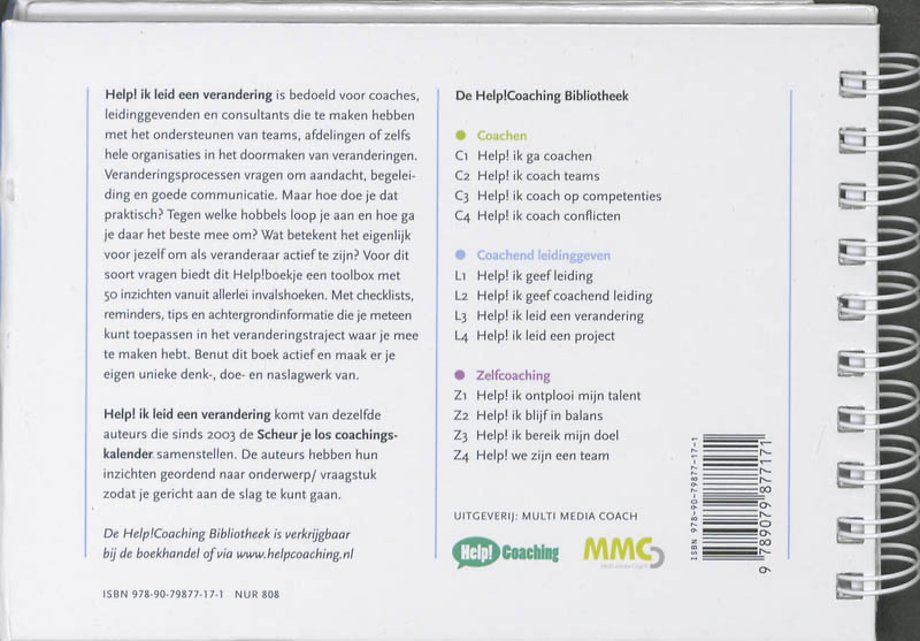 Voor dit soort vragen biedt dit Help!boekje een toolbox met 50 inzichten vanuit allerlei invalshoeken. Met checklists, reminders, tips en achtergrondinformatie die u meteen kunt toepassen in het veranderingstraject waarmee u te maken heeft. Benut dit boek actief en maak er uw eigen unieke denk-, doe- en naslagwerk van.