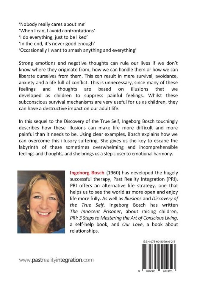 Ingeborg Bosch (1960) has developed the hugely successful therapy, Past Reality Integration (PRI). PRI offers an alternative life strategy, one that helps us to see the world as more open and enjoy life more fully. As well as Illusions and Rediscovering the true Self, Ingeborg Bosch has written The Innocent Prisoner, about raising children, PRI: 3 Steps to Mastering the Art of Conscious Living, a self-help book, and Our Love, a book about relationships.