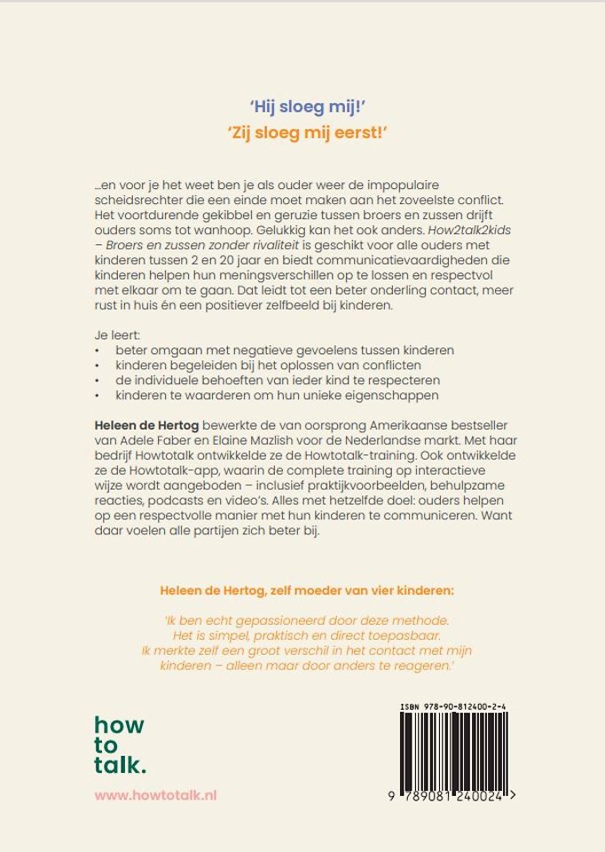 Heleen de Hertog bewerkte de van oorsprong Amerikaanse bestseller van Adele Faber en Elaine Mazlish voor de Nederlandse markt. Met haar bedrijf Howtotalk ontwikkelde ze de Howtotalk-training. Ook ontwikkelde ze de Howtotalk-app, waarin de complete training op interactieve wijze wordt aangeboden – inclusief praktijkvoorbeelden, behulpzame reacties, podcasts en video’s. Alles met hetzelfde doel: ouders helpen op een respectvolle manier met hun kinderen te communiceren. Want daar voelen alle partijen zich beter bij.