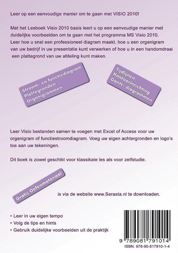 Met het Lesboek Visio 2010 basis leert u op een eenvoudige manier met duidelijke voorbeelden om te gaan met het programma MS Visio 2010. Leer hoe u snel een professioneel diagram maakt, hoe u een organigram van uw bedrijf in uw presentatie kunt verwerken of hoe u in een handomdraai een plattegrond van uw afdeling kunt maken.