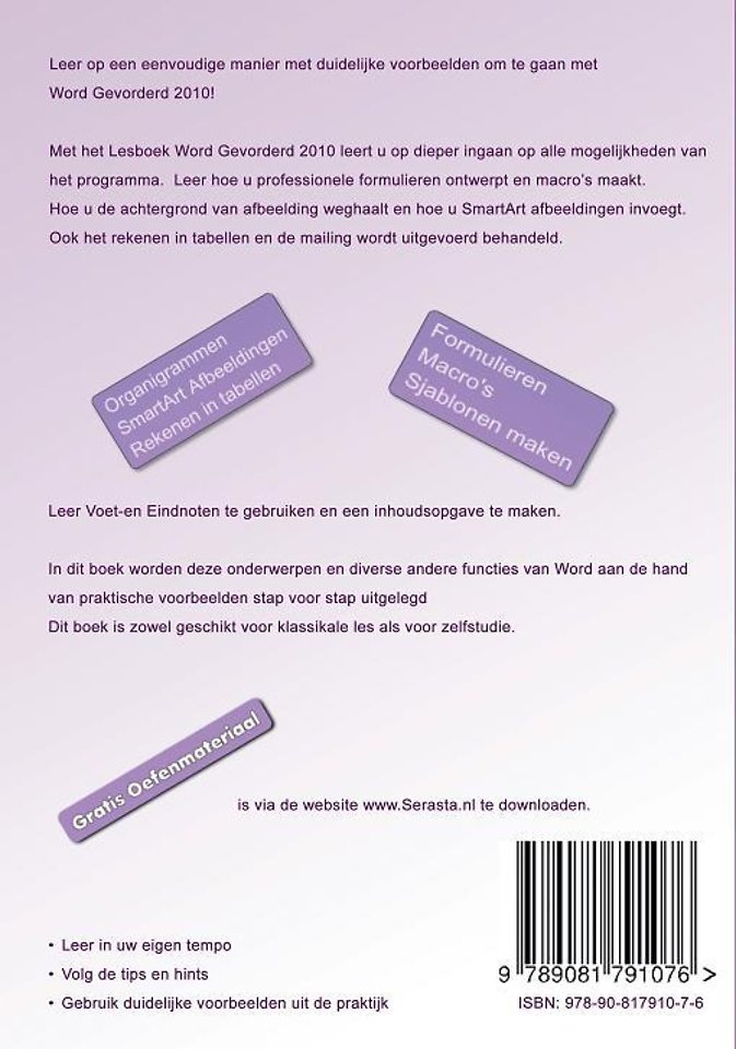 Met het Lesboek Word Gevorderd 2010 leert u op dieper ingaan op alle mogelijkheden van het programma. Leer hoe u professionele formulieren ontwerpt en macro's maakt. Hoe u de achtergrond van afbeelding weghaalt en hoe u SmartArt afbeeldingen invoegt. Ook het rekenen in tabellen en de mailing worden uitgevoerd behandeld.
