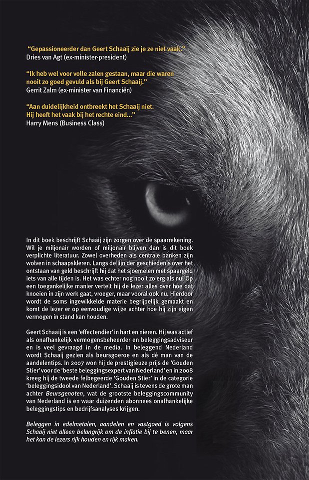 In dit boek beschrijft Schaaij zijn zorgen over de spaarrekening. Wil je miljonair worden of miljonair blijven dan is dit boek verplichte literatuur. Zowel overheden als centrale banken zijn wolven in schaapskleren. Langs de lijn der geschiedenis over het ontstaan van geld beschrijft hij dat het sjoemelen met spaargeld iets van alle tijden is.