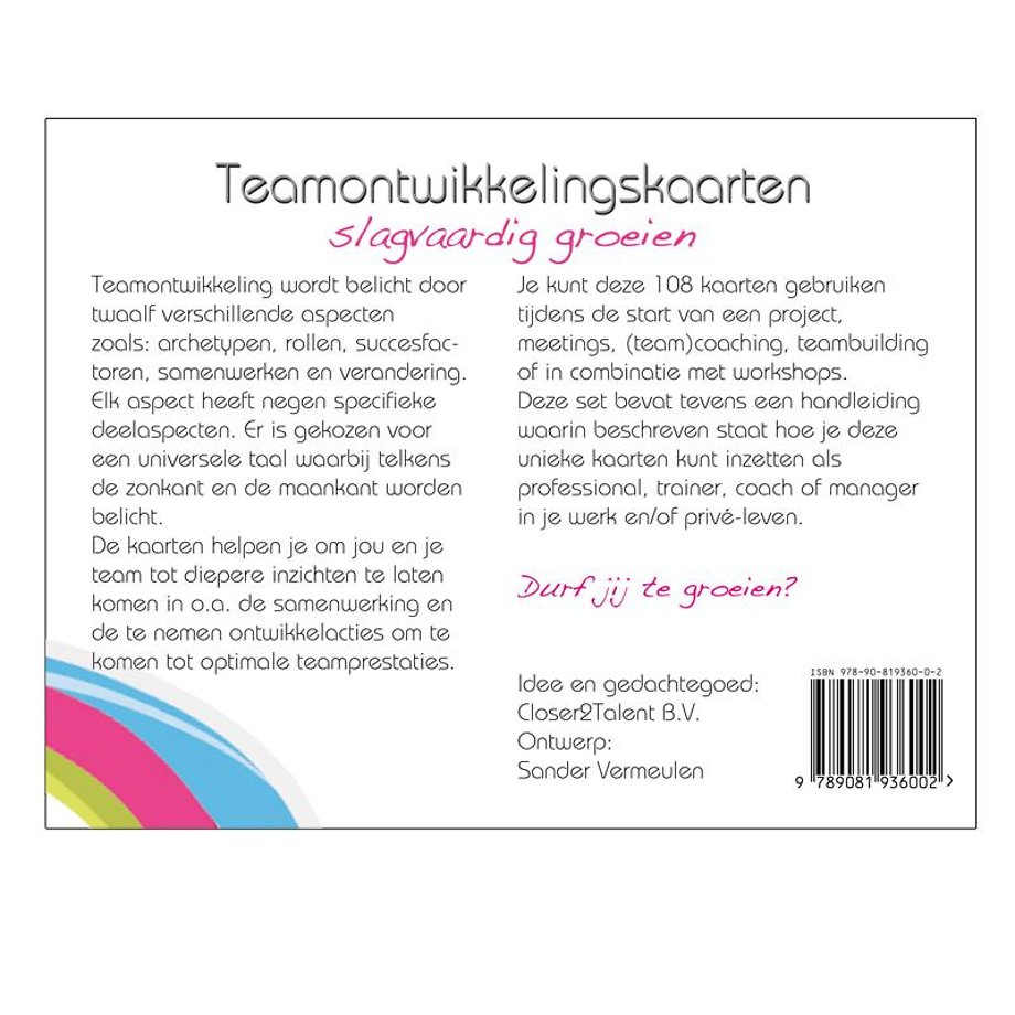 Er is gekozen voor een universele taal waarbij telkens de zonkant en de maankant worden belicht. De kaarten helpen u om u en uw team tot diepere inzichten te laten komen in o.a. de samenwerking en de te nemen ontwikkelacties om te komen tot optimale teamprestaties. U kunt deze 108 kaarten gebruiken tijdens de start van een project, meetings, (team)coaching, teambuilding of in combinatie met workshops.