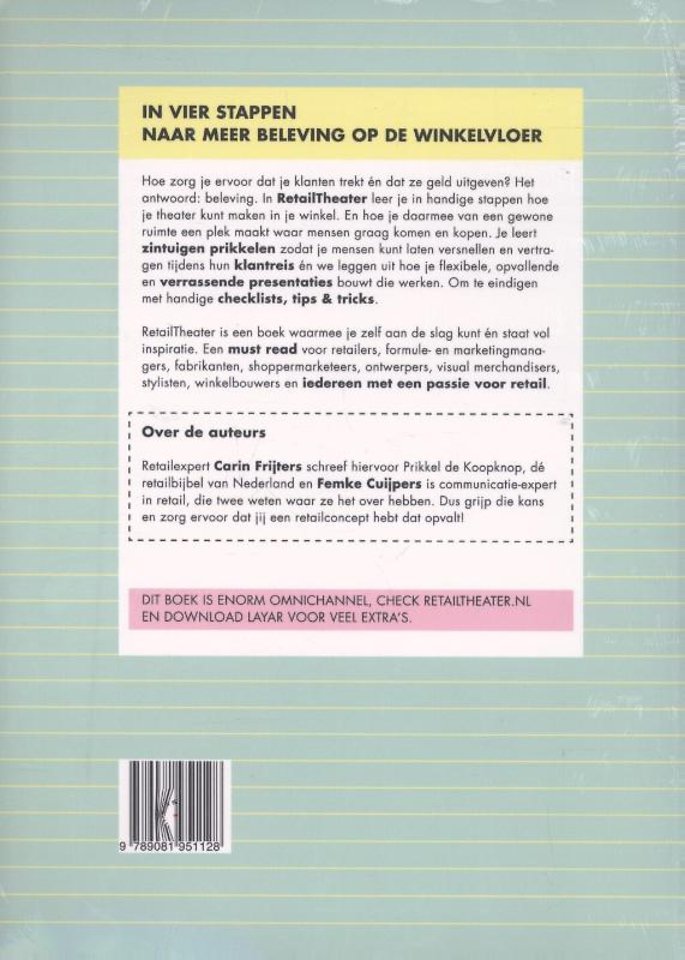 Dit boek maakt af waar het boek 'Prikkel de Koopknop' mee begon. In die uitgave vullen theorie en praktijk elkaar aan; van handige tips tot complexe strategieën en van inspirerende praktijkvoorbeelden tot de visie van experts. 'RetailTheater' is er helemaal op gericht om daadwerkelijk aan de slag te gaan op de winkelvloer. We willen met dit praktische ‘vervolg’ nog uitgebreider laten zien hoe je de aandacht van de klant op jouw winkel kunt vestigen en hoe je zorgt voor een optimale beleving. De auteurs nemen je daarvoor stap voor stap mee bij alles wat komt kijken bij retailmerchandise. Kortom, hoe speel jij het spel met je producten, maak je van winkelruimte een ontmoetingsplaats en hoe verras je daarmee telkens weer de klant tijdens zijn klantreis? Van presentatie en (binnen)etalages tot de inzet van kleur, materiaal, licht, geluid, geur, retailtechnologie en instore communicatie.