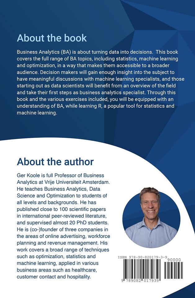 Business Analytics (BA) is about turning data into decisions. This book covers the full range of BA topics, including statistics, machine learning and optimization, in a way that makes them accessible to a broader audience. Decision makers will gain enough insight into the subject to have meaningful discussions with machine learning specialists, and those starting out as data scientists will benefit from an overview of the field and take their first steps as business analytics specialist. Through this book and the various exercises included, you will be equipped with an understanding of BA, while learning R, a popular tool for statistics and machine learning.